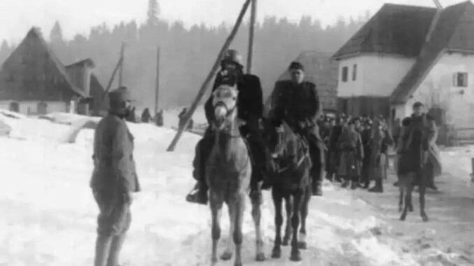 ‘Snage za žurno djelovanje’ (na slici) za spašavanje muslimanskih civila od Sokoca prema Rogatici, po dubokom snijegu na Žljebovima 1942. godine.