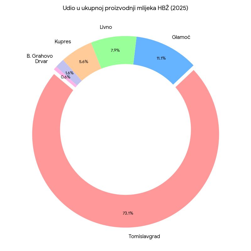 | Općina/Grad | Proizvodnja mlijeka (litara) | Udio u HBŽ (%) | Karakteristike |