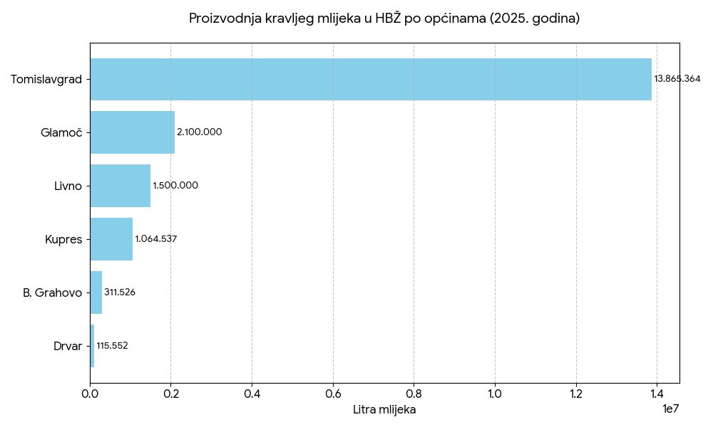Prema izvješću Ministarstva poljoprivrede, vodoprivrede i šumarstva HBŽ-a za razdoblje od 2023. do 2025. godine, srce mliječne industrije županije kuca u Tomislavgradu.