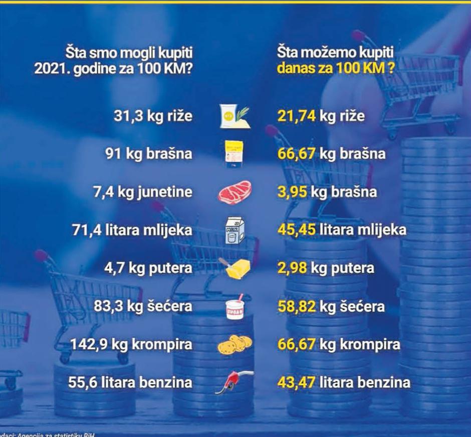 Sve ove razlike, kada se stave jedna uz drugu, jasno pokazuju da je vrijednost 100 KM danas dramatično manja nego prije četiri godine. Građani za isti iznos mogu kupiti osjetno manje svih osnovnih proizvoda koji čine svakodnevnu potrošnju, a jaz između cijena i prihoda širi se iz mjeseca u mjesec.