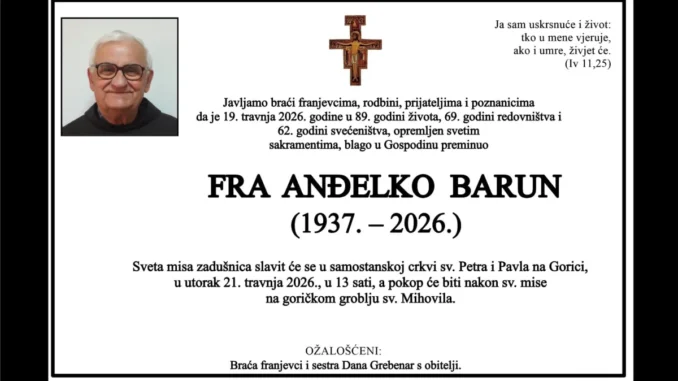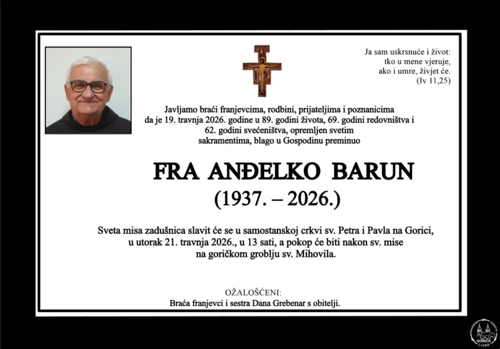 OSMRTNICA / Fra Anđelko Barun 19. travnja 2026. ADMIN Livno 0 Vrtlarija Šarić Livno Tweet Share on WhatsApp(Otvara se u novom prozoru) WhatsApp