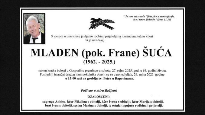 OSMRTNICA / Mladen Šuća 28. rujna 2025. ADMIN Livno 0 Vrtlarija Šarić Livno Tweet Klikni za dijeljenje na WhatsAppu(Otvara se u novom prozoru) WhatsApp