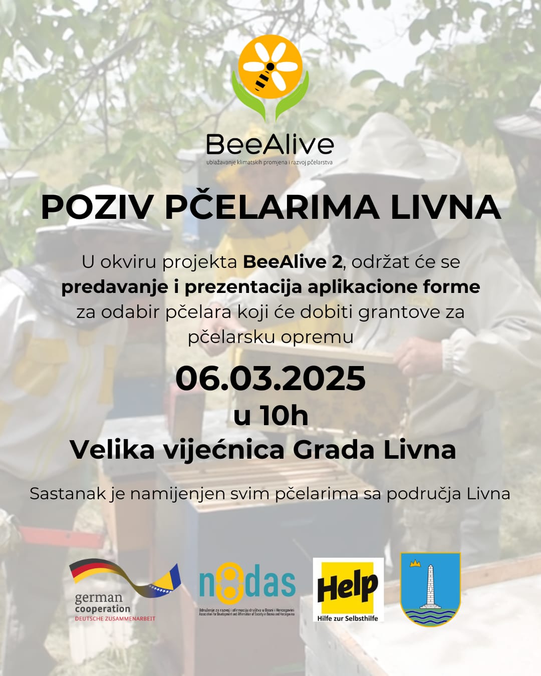U okviru projekta BeeAlive, u kojem sudjeluje i Grad Livno, održat će se predavanje i prezentacija o aplikacijskoj formi za odabir pčelara za grant sredstva namjenjena za nabavku pčelarske opreme. Predavanje i prezentacija su u četvrtak 6. ožujka 2025. u velikoj vijećnici Gradske uprave Livna u 10 sati.